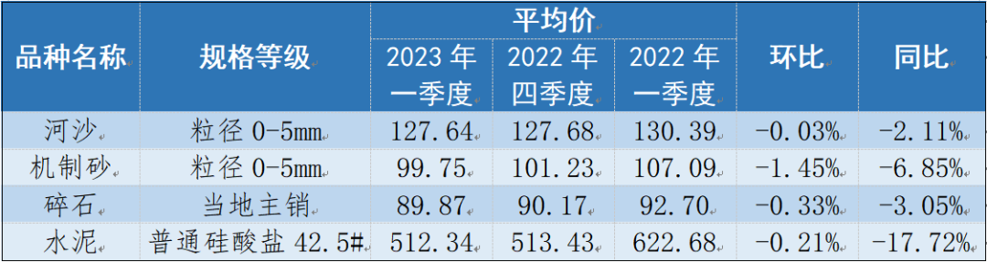 一季度全省河砂(粒徑0-5mm)、機(jī)制砂(粒徑0-5mm)、碎石(當(dāng)?shù)刂麂N(xiāo))每噸均價(jià)分別為127.64元、99.75元、89.87元,環(huán)比分別微跌0.03%、1.45%、0.33%,同比分別下跌2.11%、6.85%、3.05%,其中3月份每噸均價(jià)分別為127.01元、99.58元、90.03元,環(huán)比分別微跌0.76%、微漲0.26%、0.61%,同比分別下跌2.54%、7.06%、2.91%。
