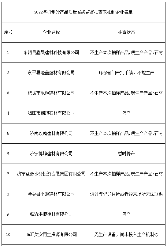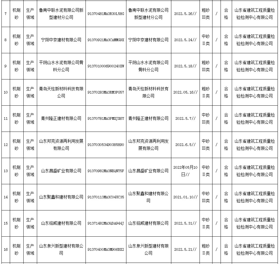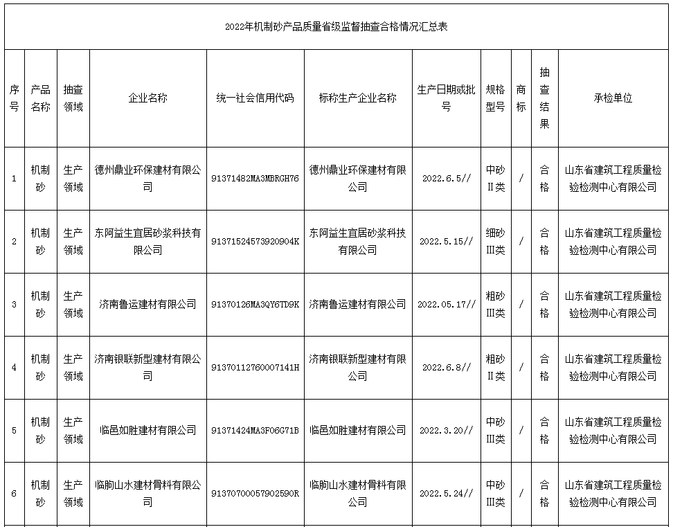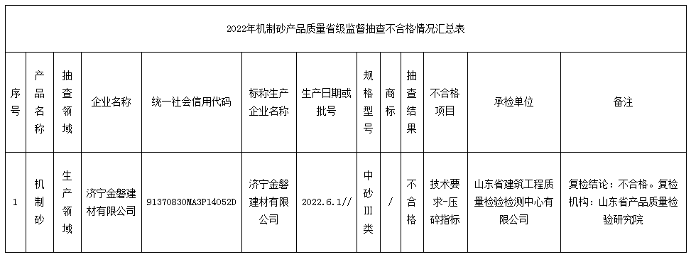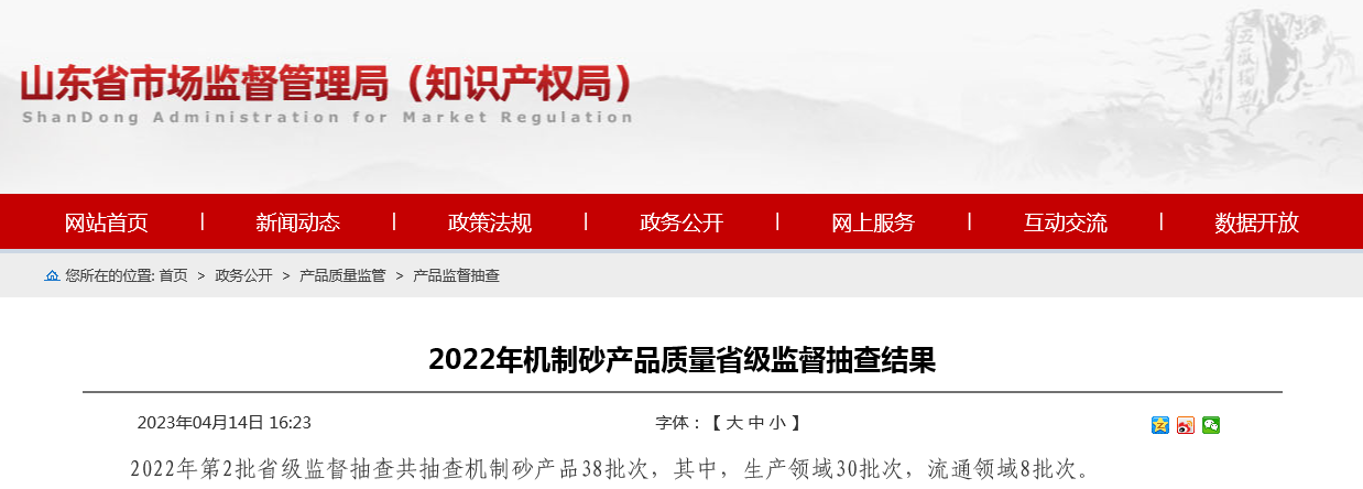 2023年4月14日,山東省市場監(jiān)督管理局網(wǎng)站公布2022年機(jī)制砂產(chǎn)品質(zhì)量省級監(jiān)督抽查結(jié)果。