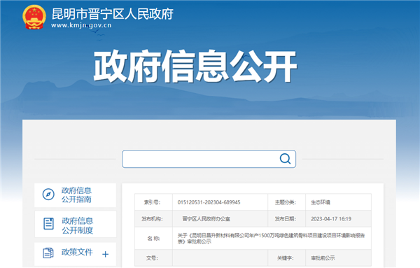 4月17日,云南省昆明市晉寧區(qū)人民政府發(fā)布了昆明日昌升新材料有限公司年產(chǎn)1500萬噸骨料項目環(huán)評公示。該項目總投資15億元,其中生產(chǎn)加工區(qū)投資9.5億元。項目建成后主要生產(chǎn)石粉、機(jī)制砂(0-5mm)、瓜子石(5-15mm)、寸子石(15-25mm)骨料產(chǎn)品。