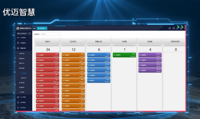 2022年起,騰遠(yuǎn)煤礦采用西安建大優(yōu)邁自主研發(fā)的“智慧礦山綜合管控系統(tǒng)”全面開展智能礦山建設(shè)。使用卡車集群協(xié)同智能調(diào)度系統(tǒng)實(shí)時(shí)跟蹤卡車、挖掘機(jī)作業(yè)狀態(tài),根據(jù)生產(chǎn)計(jì)劃作業(yè)要求,構(gòu)建全礦智能調(diào)度“超級(jí)大腦”,實(shí)時(shí)進(jìn)行調(diào)度優(yōu)化模型計(jì)算,選擇最優(yōu)路徑,全局或局部車流規(guī)劃,自動(dòng)發(fā)出調(diào)度指令。作業(yè)人員或無人設(shè)備利用移動(dòng)終端實(shí)時(shí)接收調(diào)度指令,通過移動(dòng)APP自動(dòng)導(dǎo)航至作業(yè)位置,系統(tǒng)動(dòng)態(tài)跟蹤反饋?zhàn)鳂I(yè)執(zhí)行狀態(tài),自動(dòng)完成車數(shù)計(jì)量,優(yōu)化了車鏟配比,設(shè)備作業(yè)效率大幅提高。