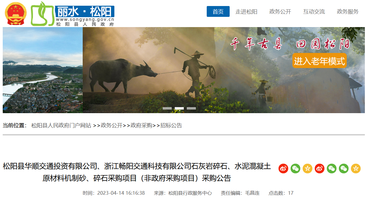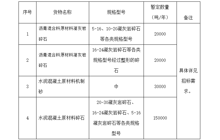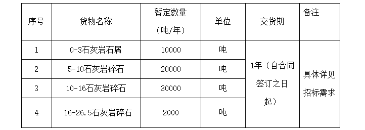 近日,浙江麗水市松陽縣人民政府發(fā)布松陽縣華順交通投資有限公司、浙江暢陽交通科技有限公司石灰?guī)r碎石、水泥混凝士原材料機(jī)制砂、碎石采購項(xiàng)目 (非政府采購項(xiàng)目) 采購公告,每年共計(jì)28.2萬噸砂石。