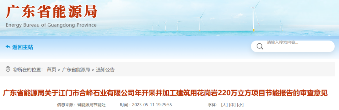 廣東省能源局關(guān)于江門市合峰石業(yè)有限公司年開(kāi)采并加工建筑用花崗巖220萬(wàn)立方項(xiàng)目