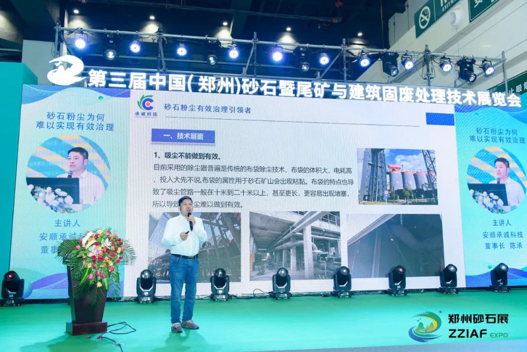 安順承誠科技董事長 陳承 作《砂石粉塵為何難以實現(xiàn)有效治理》主題報告陳承在報告中分析了砂石礦山粉塵難以治理的原因,針對綠色礦山 ≠ 綠化、環(huán)保≠環(huán)包,除塵器≠ 除塵及如何對礦山粉塵進行有效治理進行闡述。
