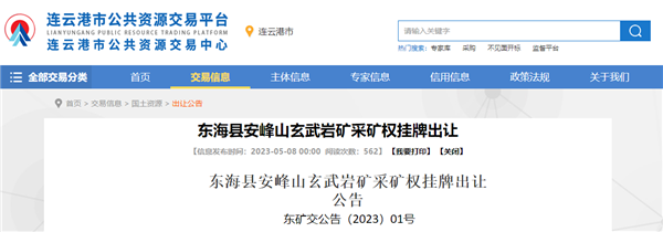 根據(jù)出讓公告,東海縣安峰山建筑用玄武巖礦采礦權(quán)位于江蘇省連云港市東海縣安峰鎮(zhèn)安峰山,礦區(qū)面積2.87平方公里,最低開采標(biāo)高+10米,開采礦種建筑用玄武巖。礦區(qū)出讓范圍內(nèi)擁有資源儲(chǔ)量735.87萬立方米(折合為2126.67萬噸,其中含原采礦權(quán)人剩余資源量686.07萬噸),可采建筑用玄武巖資源儲(chǔ)量2126.67萬噸(其中含原采礦權(quán)人剩余資源儲(chǔ)量686.07萬噸),本次掛牌實(shí)際出讓的可采資源儲(chǔ)量為1440.6萬噸。設(shè)計(jì)規(guī)模為425萬噸/年,擬出讓年限5年,起始價(jià)21954.74萬元。掛牌時(shí)間為2023年6月9日至2023年6月22日。