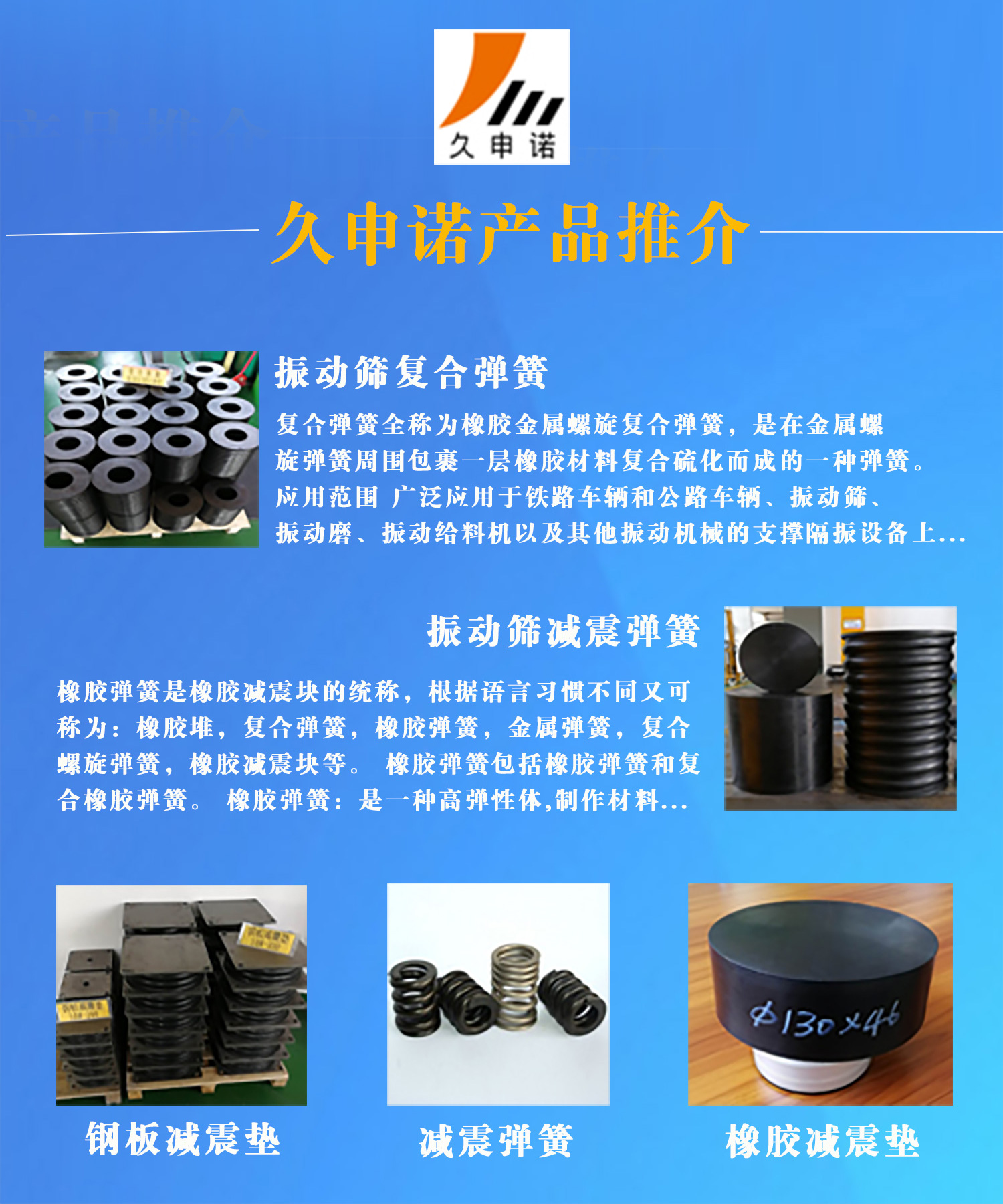 環(huán)球破碎機(jī)網(wǎng)會(huì)員單位——無錫久申諾科技有限公司(原無錫市飛達(dá)五金廠)是集研發(fā)、制造、銷售橡膠減震器的專業(yè)企業(yè),公司坐落在江蘇省無錫市錫山經(jīng)濟(jì)開發(fā)區(qū)機(jī)械裝備產(chǎn)業(yè)園內(nèi),主要生產(chǎn)各類振動(dòng)機(jī)械用橡膠減震器,其產(chǎn)品有:橡膠彈簧、橡膠-金屬螺旋復(fù)合彈簧(簡(jiǎn)稱復(fù)合彈簧)、橡膠減震墊、鋼板橡膠減震器等。