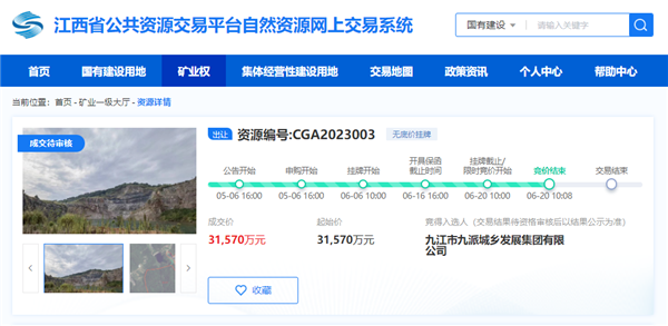 6月20日,江西省九江市柴桑區(qū)朗山礦區(qū)建筑石料用灰?guī)r礦競價結(jié)束,目前處于成交待審核階段,競得入選人九江市九派城鄉(xiāng)發(fā)展集團(tuán)有限公司為當(dāng)?shù)貒蟆?jù)了解,該礦資源儲量14350萬噸,開采規(guī)模700萬噸/年,擬出讓年限22.5年(基建期2年、生產(chǎn)期20.5年),成交價31570萬元。另外,競得人還需額外支付政策處置費(fèi)93275萬元,經(jīng)計(jì)算,該礦資源價款為9.7元/噸。
