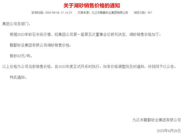 6月26日,江西省九江市贛鄱砂業(yè)集團(tuán)有限公司根據(jù)2023年砂石市場(chǎng)行情,將其湖砂銷售價(jià)格調(diào)整為粗砂83元/噸,該價(jià)格自2023年度鄱陽(yáng)湖砂正式開(kāi)采時(shí)執(zhí)行。