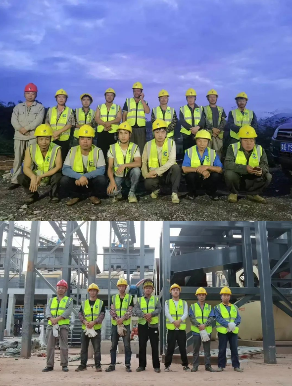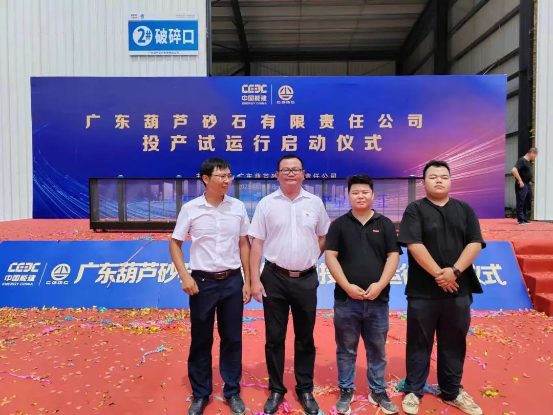 (廣東葫蘆砂石公司項目部副總經(jīng)理鐘劍(左一)、廣東葫蘆砂石公司董事長梅涵(左二)與承誠科技大區(qū)經(jīng)理宋超、羅煒親切合影)