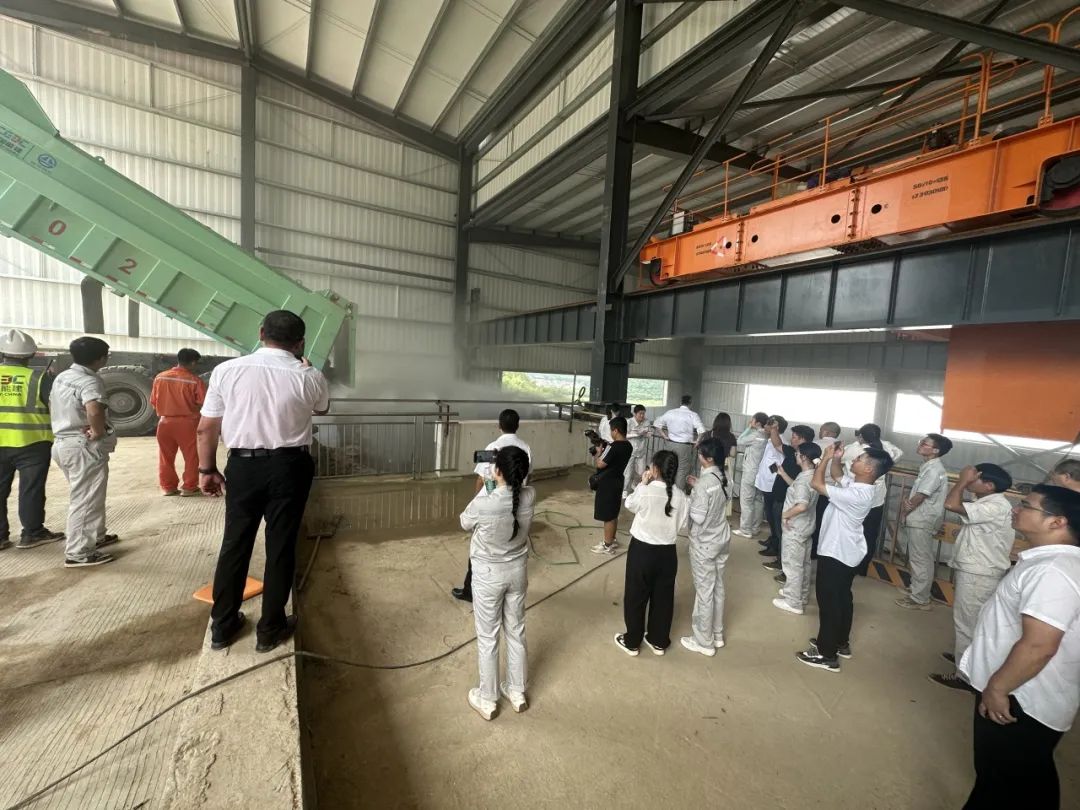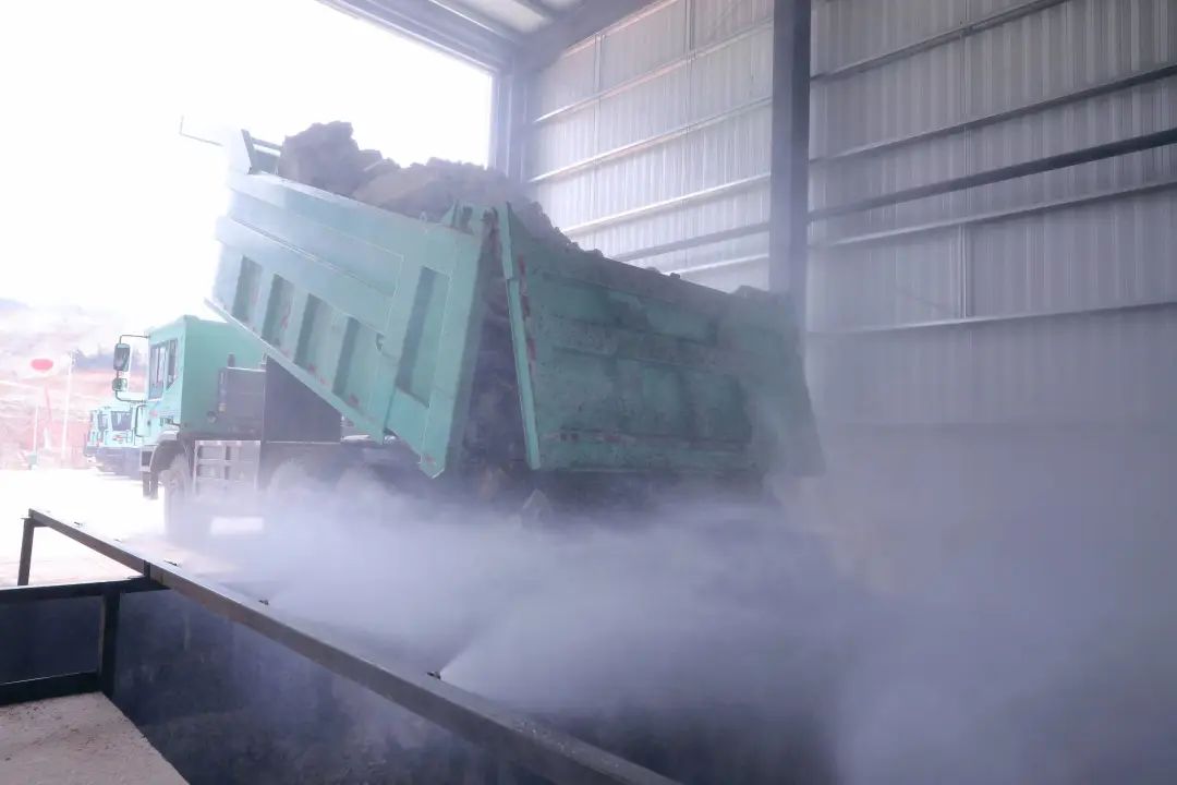 (卡車卸料時,高壓噴霧系統(tǒng)通過感應(yīng)自動開啟抑塵措施,即使距離如此近也不需要戴口罩)