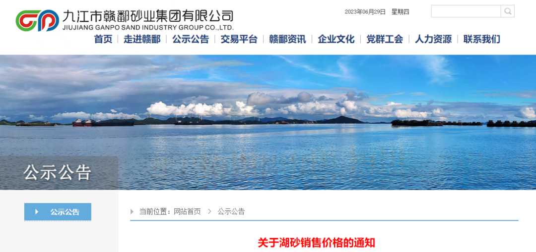 2023年6月26日,江西省九江市贛鄱砂業(yè)集團(tuán)有限公司根據(jù)2023年砂石市場(chǎng)行情,將其湖砂銷售價(jià)格調(diào)整為粗砂83元/噸,該價(jià)格自2023年度鄱陽(yáng)湖砂正式開(kāi)采時(shí)執(zhí)行。