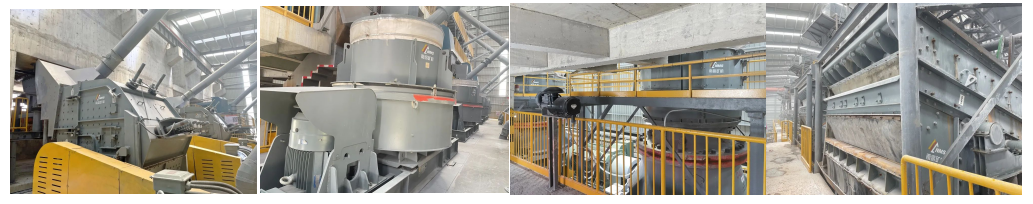 生產(chǎn)線共采用40臺南礦集團生產(chǎn)的性能優(yōu)越、節(jié)能高效的大型設(shè)備,具體包括棒條給料機HPF20603臺、顎式破碎機JC2000M 3臺、反擊式破碎機HS1523S 4臺、立軸沖擊式破碎機VS1500R 4臺、圓錐式破碎機CC600MF2臺、圓振動篩2YKR3075H 8臺、圓振動篩YKR3075H 4臺、圓振動篩3YKR3060H 8臺、圓振動篩3YKR3675H 2臺、螺旋洗石機2WCDS1118 2臺,由顎破+反擊破+圓錐整形組成三級破碎。