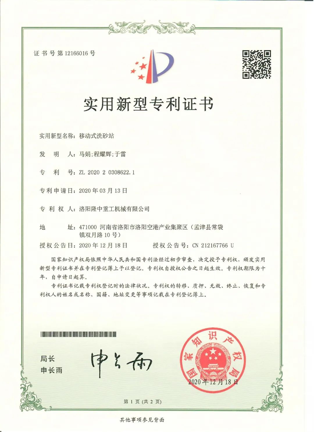 實用新型專利證書