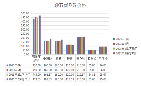 日前,四川恩陽區(qū)發(fā)展和改革局發(fā)布2023年二季度全區(qū)主要商品和服務(wù)價格監(jiān)測情況的報告,其中,機(jī)制粗砂出廠均價160元/立方米,較上月持平,較同期下降12.5%、下跌20元/立方米;碎石(綜合未水洗,5-20mm)出廠均價120元/立方米,較上月持平,較同期上漲5.56%,漲幅6.67元/立方米;天然砂均價212.67元/立方米,較上月持平,較同期下降1.1%、下跌2.33元/立方米。