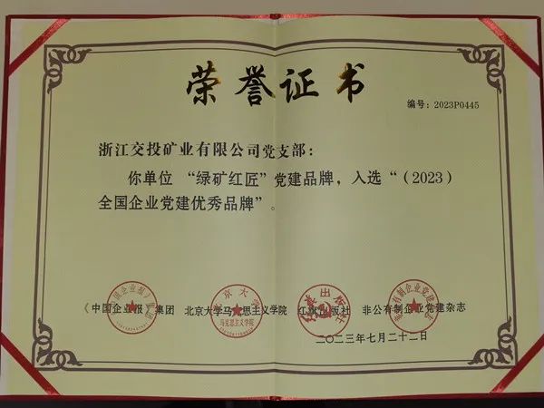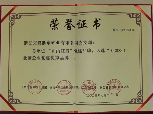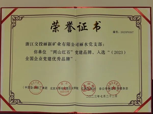 7月22日,2023全國企業黨建(案例)研討會暨第三屆企業黨建創新優秀案例發布儀式在京召開,浙江交通資源投資集團旗下交投礦業“綠礦紅匠”,麗新礦業“兩山紅石”浙東礦業“山海紅石”等3個黨建品牌獲評“2023年度全國企業黨建創新優秀品牌”榮譽稱號。
