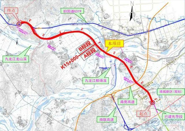 工程概況:項目路線起于漳州高新區(qū)靖城園區(qū)田邊村,順接現(xiàn)狀國道 G319 線,與規(guī)劃田下路平面交叉,路線向西北延伸建田邊分離式大橋上跨甬莞高速,經(jīng)珩坑村、湖山村,建湖山大橋跨九龍江船場溪,之后沿九龍江防洪堤內(nèi)側(cè)布線,經(jīng)阡橋、尚寨村,建尚寨大橋跨九龍江龍山溪,終于南靖牛崎頭,順接現(xiàn)狀國道 G319 線南靖段。項目全線采用一級公路標(biāo)準(zhǔn)兼具城市道路功能建設(shè),設(shè)計速度 80 公里/小時(終點過渡段設(shè)計速度為 60 公里/小時),其中 K10+910~K12+020 段采用雙向八車道,路基寬度 39 米,K12+020~K19+292 段采用雙向六車道,路基寬度 33 米。