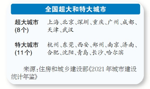 根據(jù)國(guó)務(wù)院于2014年下發(fā)的《關(guān)于調(diào)整城市規(guī)模劃分標(biāo)準(zhǔn)的通知》,城區(qū)常住人口1000萬(wàn)以上的城市為超大城市,城區(qū)常住人口500萬(wàn)以上1000萬(wàn)以下的城市為特大城市。根據(jù)住房和城鄉(xiāng)建設(shè)部公布的《2021年城市建設(shè)統(tǒng)計(jì)年鑒》,截至2021年末,全國(guó)共有超大城市8個(gè),分別為上海、北京、深圳、重慶、廣州、成都、天津、武漢。全國(guó)特大城市11個(gè),分別為杭州、東莞、西安、鄭州、南京、濟(jì)南、合肥、沈陽(yáng)、青島、長(zhǎng)沙、哈爾濱。