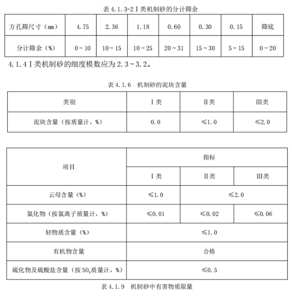 機制砂的粗細(xì)程度可按其細(xì)度模數(shù)分為粗砂、中砂、細(xì)砂,并應(yīng)符合下列規(guī)定:粗砂:3.7~3.1、中砂:3.0~2.3/細(xì)砂:2.2~1.6。