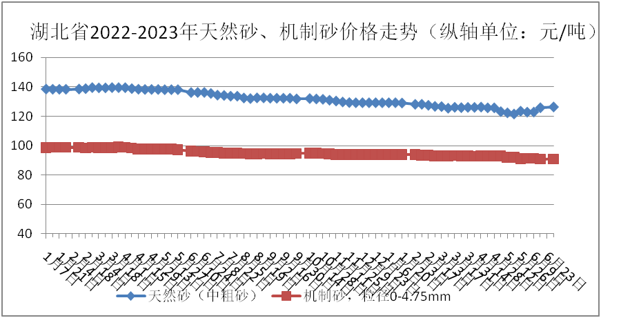 近日,湖北省價格監(jiān)測中心發(fā)布6月份湖北市場砂石價格,其中,天然砂(中粗砂)124.52元/噸、機制砂91.06元/噸,碎石(粒徑5-16mm)80.42元/噸、碎石(粒徑17-31.5mm)86.39元/噸,6月份湖北省砂石價格整體下降。
