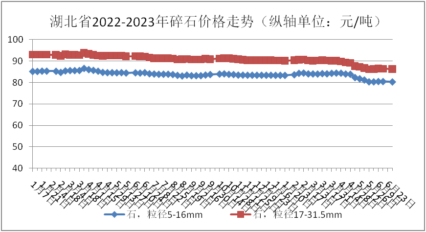 監(jiān)測數(shù)據(jù)顯示:6月份,碎石(粒徑5-16mm)、碎石(粒徑17-31.5mm)全省均價分別為80.42元/噸、86.39元/噸,環(huán)比分別下跌:1.25%、0.67%;同比分別下跌:4.91%和6.33%。具體價格走勢情況如下圖: