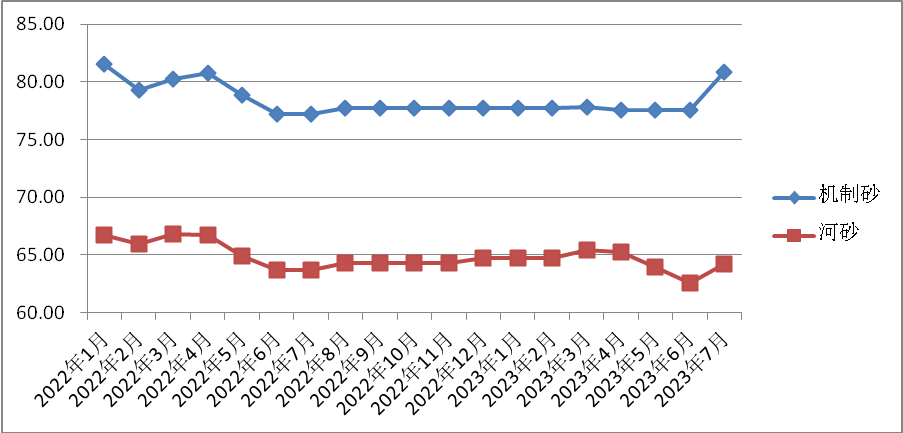 7月份,甘肅省砂石平均出廠價(jià)格機(jī)制砂(細(xì)砂)每噸80.89元,河砂(細(xì)砂)每噸64.18元,環(huán)比分別上漲4.29%、2.61%;同比,機(jī)制砂上漲4.75%,河砂上漲0.85%。