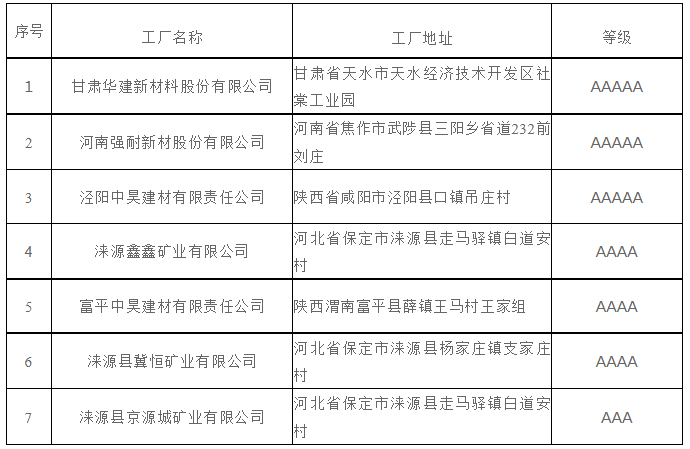 根據(jù)《全國砂石及裝備企業(yè)綠色工廠認(rèn)定管理辦法》的規(guī)定,經(jīng)企業(yè)申報、第三方評價、評審委員會評審、評審結(jié)果公示及協(xié)會認(rèn)定等程序,甘肅華建新材料股份有限公司等7家企業(yè)滿足砂石行業(yè)綠色工廠的要求,決定授予“砂石行業(yè)綠色工廠”稱號,現(xiàn)將“2022年度砂石行業(yè)綠色工廠”名單及相應(yīng)等級予以公布。