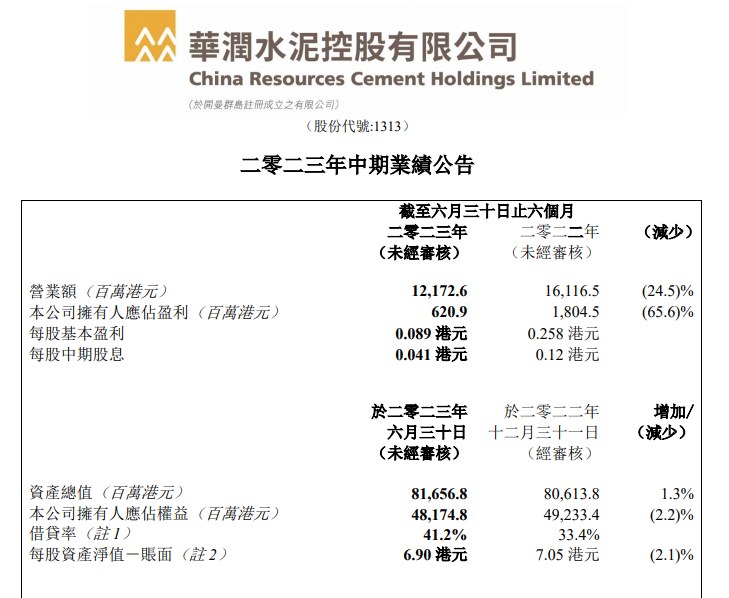8月18日,華潤(rùn)水泥控股有限公司(簡(jiǎn)稱(chēng)“華潤(rùn)水泥”)發(fā)布2023年中期業(yè)績(jī)公告稱(chēng),2023年上半年公司實(shí)現(xiàn)營(yíng)收約121.73億港元,同比減少24.5%;歸屬股東凈利潤(rùn)6.21億港元,同比減少65.6%。