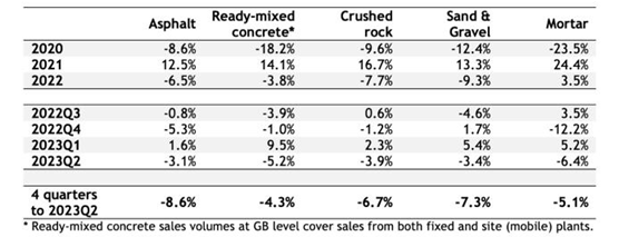 過去一年,數(shù)據(jù)顯示,隨著疫情導(dǎo)致的生產(chǎn)消費(fèi)抑制的消退以及經(jīng)濟(jì)挑戰(zhàn)浮出水面,建筑礦物產(chǎn)品的需求大幅下降。盡管2021年出現(xiàn)強(qiáng)勁反彈,推動(dòng)瀝青和碎石銷量達(dá)到十多年來的最高水平,但通脹、利率上升和商業(yè)信心疲軟的影響減緩了新建設(shè)項(xiàng)目的開工速度,導(dǎo)致銷量再次下滑對(duì)重型建筑材料的需求。