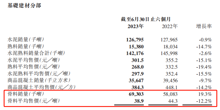 骨料方面,銷售6930.3萬噸,同比增長19.3%;平均售價(jià)38.9元/噸,同比下降12.2%;水泥方面,銷售約1.3億噸,同比下降0.9%;平均售價(jià)301.5元/噸,同比下降15.1%;熟料方面,銷售1538萬噸,同比下降14.7%;平均售價(jià)268元/噸,同比下降19.4%;商混方面,銷售3564.7萬方,同比下降9.7%;平均售價(jià)384.3元/方,同比下降14.2%。