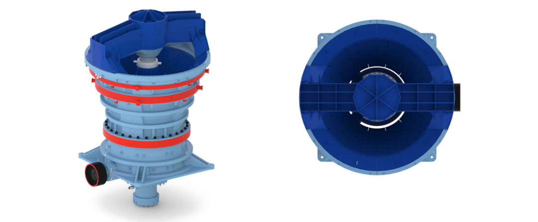 主軸整體鍛造,避免動(dòng)錐松動(dòng)風(fēng)險(xiǎn)。上部軸頸與錐體過渡部位,大半徑拋光圓角, 增加了抗疲勞強(qiáng)度,同時(shí)經(jīng)過軟件模擬保證留有足夠安全系數(shù)。