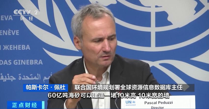 聯(lián)合國環(huán)境規(guī)劃署全球資源信息數(shù)據(jù)庫主任 帕斯卡爾·佩杜:60億噸海砂可以建造一堵10米高、10米寬的墻,足夠環(huán)繞地球一圈。或者相當于全球80億人每人每天開采2千克,每天可以裝滿100多萬輛卡車。