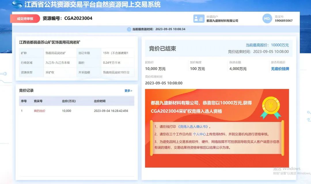 9月5日,江西省九江市都昌縣首宗“凈采礦權(quán)”——江西省都昌縣蘇山礦區(qū)飾面用花崗巖礦采礦權(quán)在江西省公共資源交易中心成功出讓,實(shí)現(xiàn)采礦權(quán)出讓收入4.1億元,競得人為都昌九盛新材料有限公司。