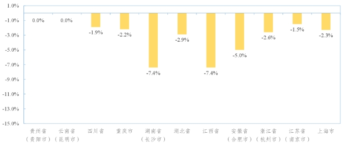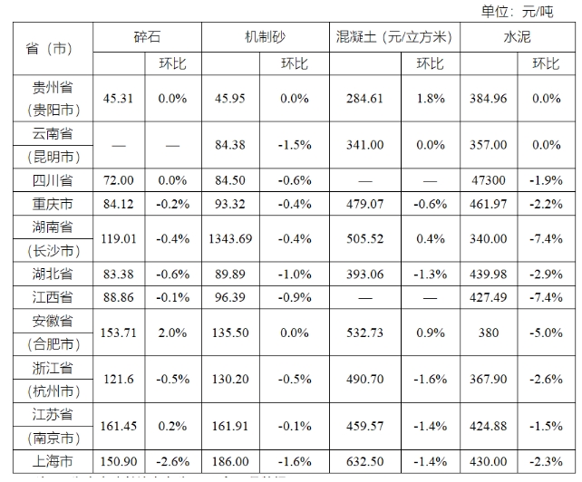 機制砂持續下跌,跌幅整體呈中上游擴大、下游收窄趨勢。其中,中上游的云南省(昆明市)、重慶市、湖南省(長沙市)、湖北省、江西省跌幅擴大,四川省跌幅收窄1.1個百分點,貴州省(貴陽市)與上月持平;下游浙江省(杭州市)、江蘇省(南京市)跌幅分別收窄0.7、2.1個百分點,安徽省(合肥市)止跌企穩,上海市持續下跌、跌幅與上月持平。