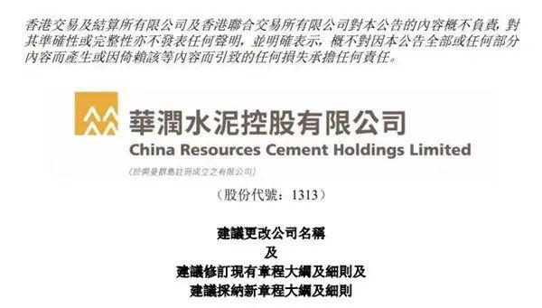 9月22日,華潤水泥連發三則公告,分別為《非執行董事及董事局專門委員會成員之變更》、《董事名單與其角色和職能》、《建議更改公司名稱及建議修訂現有章程大綱及細則及建議采納新章程大綱及細則》。華潤水泥董事局建議,將公司英文名稱及雙重外文中文名稱進行變更。
