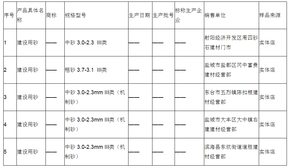 江蘇省鹽城市市場(chǎng)監(jiān)管局抽查建設(shè)用砂產(chǎn)品5批次均合格