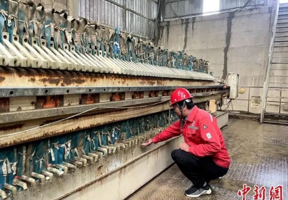 記者在現(xiàn)場看到,在兩個足球場大的生產(chǎn)車間里,就地新開采的原料由機械裝進(jìn)給料倉后,經(jīng)過