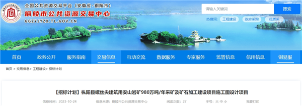 10月24日,安徽省銅陵市公共資源交易中心發(fā)布樅陽縣螺絲尖建筑用安山巖礦980萬噸/年采礦及礦石加工建設(shè)項目施工圖設(shè)計項目招標(biāo)計劃,計劃招標(biāo)時間2023年11月。招標(biāo)人為安徽玄武新材料有限公司。