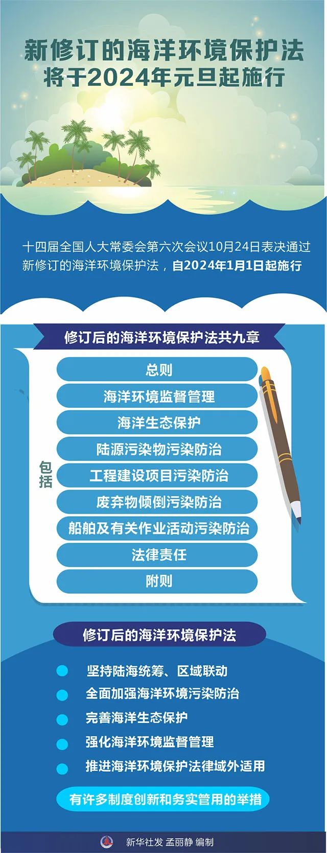 2023年10月24日,十四屆全國(guó)人大常委會(huì)第六次會(huì)議修訂通過(guò)《中華人民共和國(guó)海洋環(huán)境保護(hù)法》(以下簡(jiǎn)稱《保護(hù)法》),國(guó)家主席習(xí)近平簽署主席令予以公布,自2024年1月1日起施行。