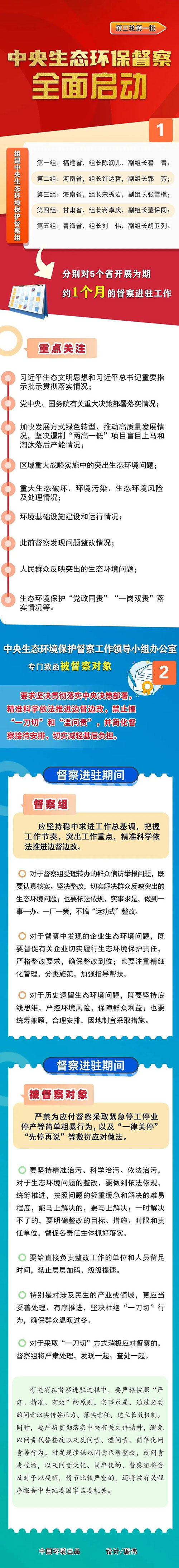 根據(jù)《中央生態(tài)環(huán)境保護督察工作規(guī)定》,經(jīng)黨中央、國務(wù)院批準(zhǔn),第三輪中央生態(tài)環(huán)境保護督察11月21日全面啟動。第一批組建5個中央生態(tài)環(huán)境保護督察組,分別對福建、河南、海南、甘肅、青海5個省開展為期約1個月的督察進駐工作。
