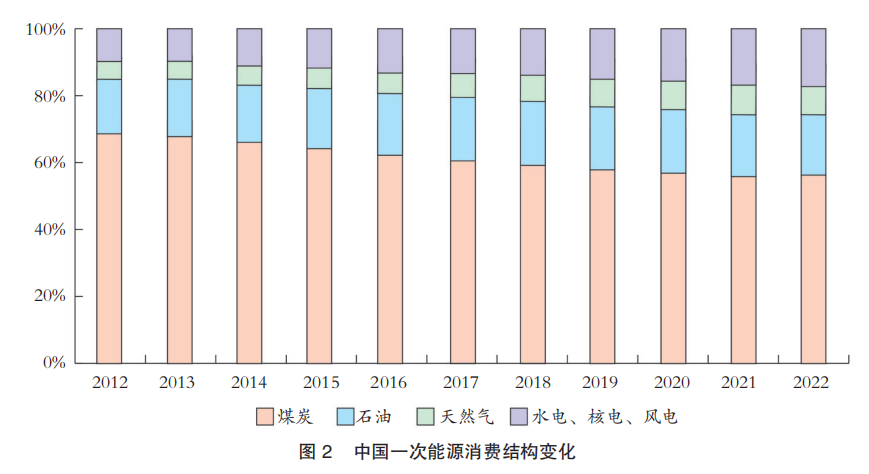我國(guó)能源消費(fèi)結(jié)構(gòu)持續(xù)優(yōu)化(見圖2)。2022年煤炭消費(fèi)占一次能源消費(fèi)總量的比重為56.2%,石油占比17.9%,天然氣占比8.4%,水電、核電、風(fēng)電、太陽(yáng)能發(fā)電等非化石能源占比17.5%。與十年前相比,煤炭消費(fèi)占能源消費(fèi)比重下降了12.3個(gè)百分點(diǎn),水電、核電、風(fēng)電、太陽(yáng)能發(fā)電等非化石能源比重提高了7.8個(gè)百分點(diǎn)。