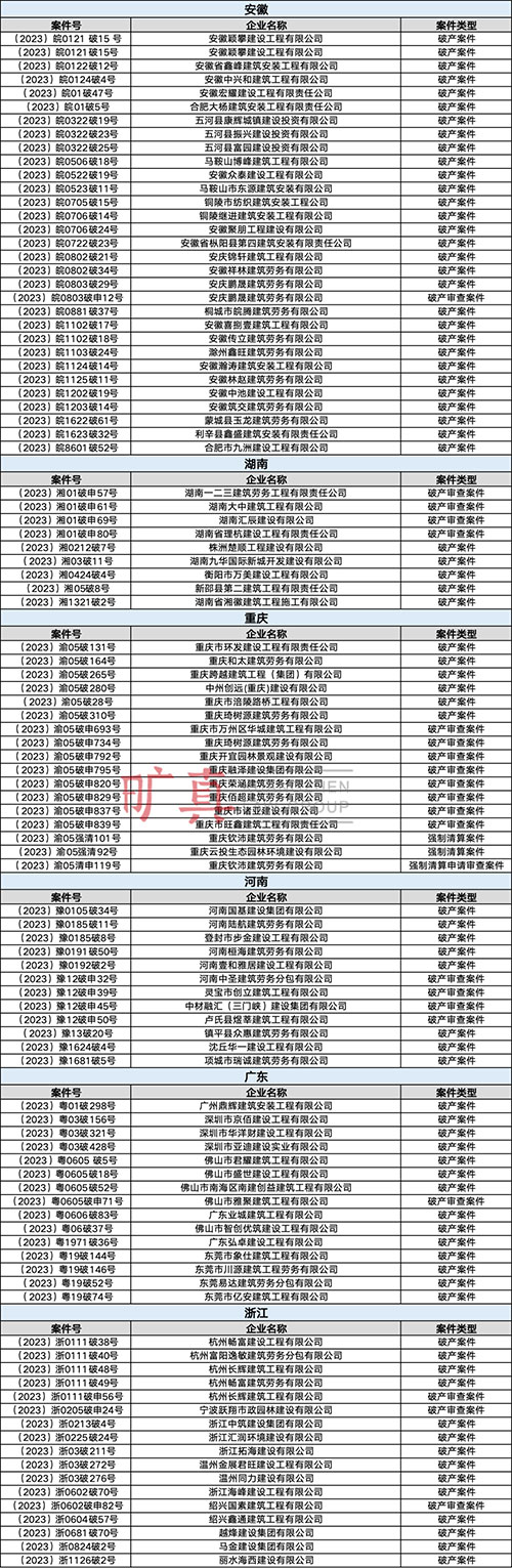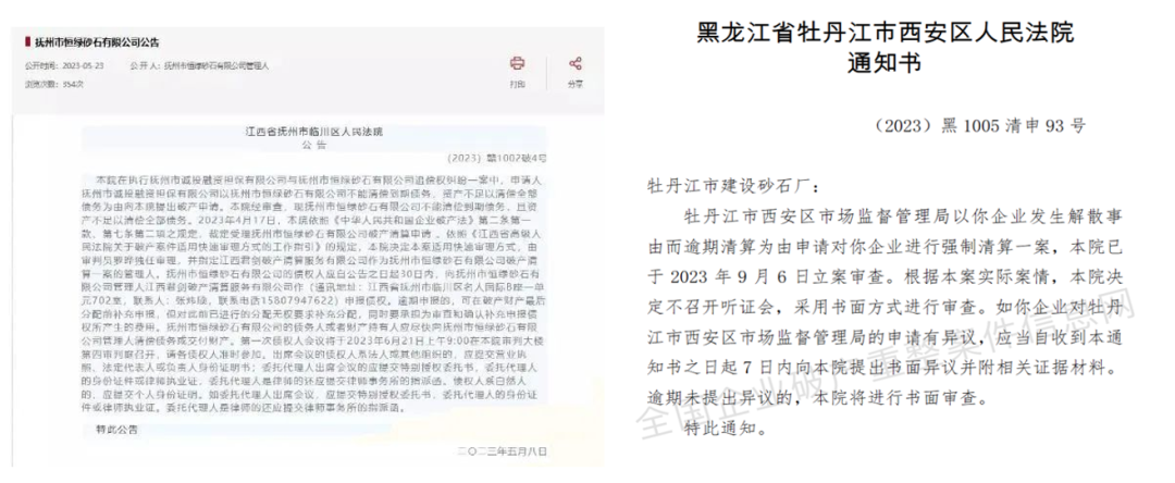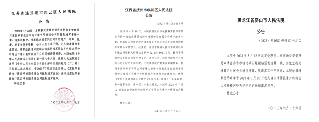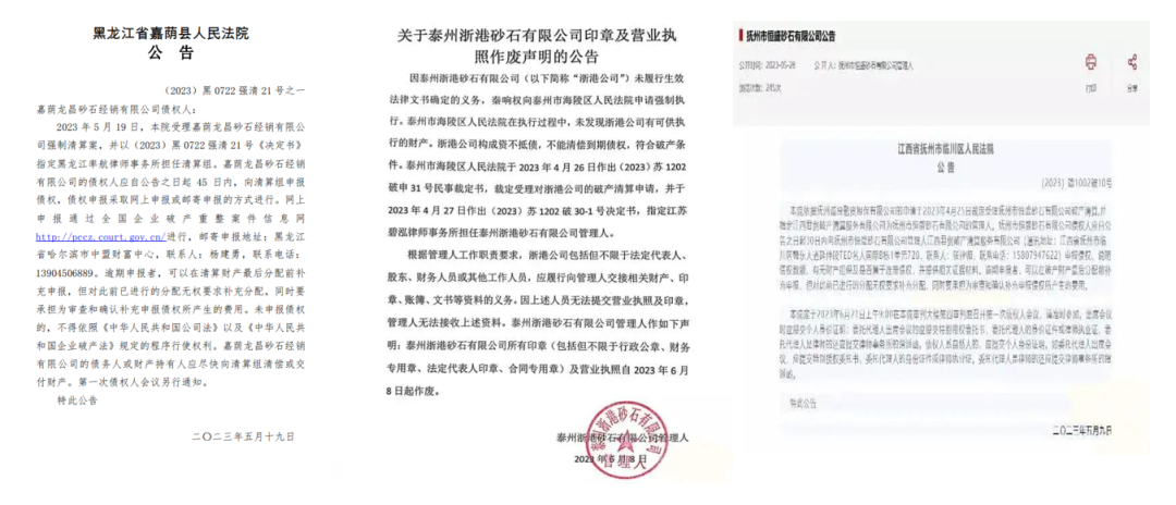 東巨砂石進(jìn)出口連云港有限責(zé)任公司、東巨砂石進(jìn)出口連云港有限責(zé)任公司、密山市穆棱河砂石經(jīng)銷站、嘉蔭龍昌砂石經(jīng)銷有限公司、泰州浙港砂石有限公司、撫州市恒盛砂石有限公司、撫州市恒綠砂石有限公司、重慶雷蒙洛克砂石制品有限公司破產(chǎn)、廣西路源建材公司破產(chǎn)清算資產(chǎn)二次拍賣、雞西市雞冠區(qū)太陽升村砂石廠、黑龍江省牡丹江市建設(shè)砂石廠等砂石企業(yè)、建材企業(yè)破產(chǎn)清算或進(jìn)入破產(chǎn)程序。