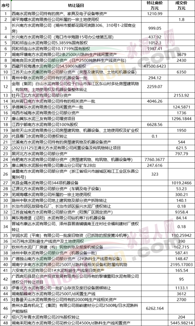 據(jù)不完全統(tǒng)計,今年以來成交以及正在披露轉(zhuǎn)讓的48個水泥廠項目,涉及金額12.67億元,其中已成交33個項目,成交金額合計4.97億元,正在披露轉(zhuǎn)讓的15個項目轉(zhuǎn)讓底價合計7.7億,個別項目或因轉(zhuǎn)讓金額涉及資金額較大,從年初2月份開始掛牌出讓,至今未成交。