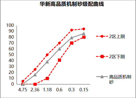 華新高品質(zhì)機(jī)制砂技術(shù)指標(biāo)參數(shù)圖(2區(qū)連續(xù)級(jí)配,細(xì)度模數(shù)2.8,壓碎值10%,片狀含量≤3%,含粉量7%-9%)