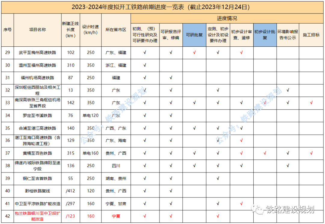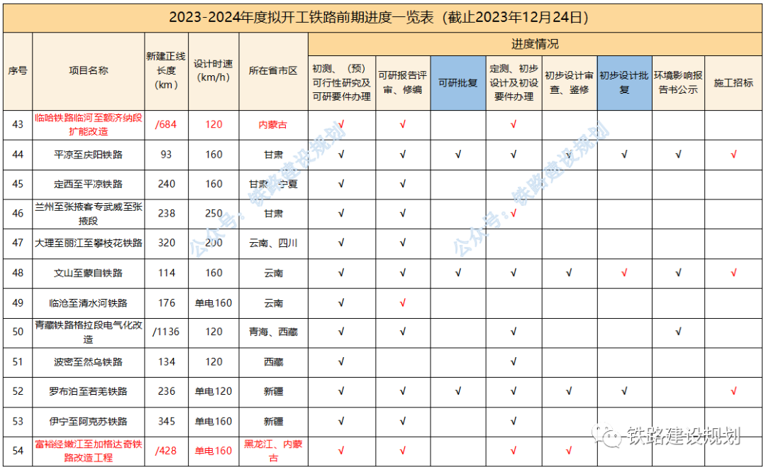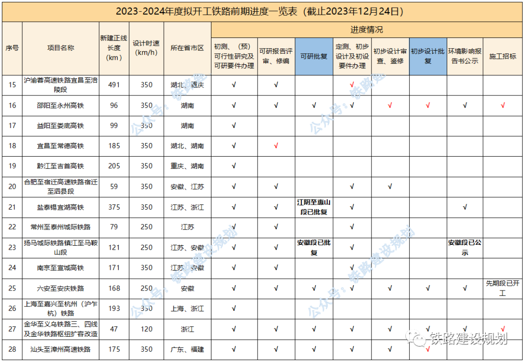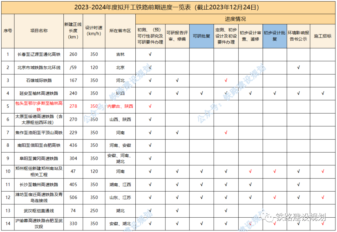 今年以來,已有延榆、邵永、濰宿、合武、濟棗等多個高鐵項目和黃百、平慶、蒙文、羅若等多個普鐵項目以及格庫鐵路等擴能改造項目實現(xiàn)開工目標。 2024年,國家鐵路推進的重點依然是“八縱八橫”高鐵通道未貫通路段的建設,包括呼南高鐵焦洛平段、宜常段,沿江高鐵宜涪段,沿海高鐵溫福段,包(銀)海高鐵包鄂榆段等,以及都市圈重點城際鐵路如石雄城際等,如進展順利,年底前有望開工。 原計劃今年開工,因各種原因有所推遲的長贛、湛海、合湛高鐵也有望在明年初實現(xiàn)開工目標;近期漳汕高鐵、武平至梅州高鐵有望啟動施工招標。 包括已納入“十四五”鐵路開工計劃,但在2023年進展不明顯的項目,如:長遼通、牡敦、太綏、滬乍杭、阜黃、蘭張高鐵武張段,武漢樞紐直通線、大麗攀、溫武吉、常岳九、文山至靖西鐵路等,預計在2024年會有大的突破。 “十四五”規(guī)劃研究項目,包括南信合、黔吉高鐵等,均屬于省際城際鐵路性質(zhì),國家不主導建設,全面開工預計需到2025年左右。 各項目最新進展情況匯總?cè)缦拢?023年10月1日以來): 1、合肥至武漢、濰坊至宿遷、邵陽至永州、南深高鐵廣東段,黃桶至百色、平?jīng)鲋翍c陽、文山至蒙自鐵路,鄭州樞紐、金華地區(qū)擴容改造相關工程初步設計均已批復,施工已招標; 2、長沙至贛州高鐵環(huán)境影響報告書生態(tài)環(huán)境部已暫緩審查,正完善長沙城區(qū)段環(huán)評相關措施,初步設計待批復; 3、沿江高鐵宜昌至涪陵段可研報告國家發(fā)改委已完成評估,待批復;用地預審已獲自然資源部批復; 4、呼南高鐵宜昌至常德段國鐵集團已完成可研鑒修審查,正推進可研審批相關前置要件辦理; 5、呼南高鐵焦洛平段用地預審已正式獲得自然資源部批復; 6、漳州至汕頭高鐵初步設計已批復,具備施工招標條件; 7、龍龍高鐵武平至梅州段可研已批復,初步設計11月底已通過國鐵集團審查待批復; 8、合浦至湛江高鐵受廣西段環(huán)評影響,調(diào)整初步設計待批復;湛江至海口高鐵可研待批復; 9、鹽泰錫常宜高鐵過江通道段已完成可研咨詢,正推進可研批復; 10、綿遂內(nèi)城際鐵路綿陽至遂寧段初步設計僅剩接軌方案未批復,明年初有望開工; 11、中衛(wèi)至平?jīng)鲨F路擴能改造工程初步設計已通過國鐵集團審查; 12、新增年度計劃開工及儲備開工項目: 包頭至鄂爾多斯至榆林高鐵,正開展可研前期工作;包蘭鐵路銀川至中衛(wèi)段擴能改造工程,已完成可研評審;臨哈鐵路臨河至額濟納段擴能改造工程,已完成可研鑒修審查;富裕至加格達奇鐵路改造工程,已通過初步設計預審。 2023-2024年度計劃開工鐵路前期進度一覽表▼ 基建是國家經(jīng)濟發(fā)展的核心,也是砂石骨料需求的主要來源,2024年如果大量高鐵、高速、城中村改造項目能夠落實的話,有望為提振國內(nèi)砂石市場態(tài)勢發(fā)揮積極作用。 但同時,我們也要客觀考慮另外一個問題,近幾年砂石礦權(quán)投資熱度持續(xù)高漲,部分地區(qū)產(chǎn)能釋放過度,長江地區(qū)已經(jīng)出現(xiàn)了明顯產(chǎn)能過剩的情況,隨著國家宏觀政策的調(diào)整、經(jīng)濟的持續(xù)向好回升以及基建對砂石需求的拉動,在一定程度上可以抵消產(chǎn)能過剩帶來的負面影響,但隨著新砂石礦山的陸續(xù)投產(chǎn)