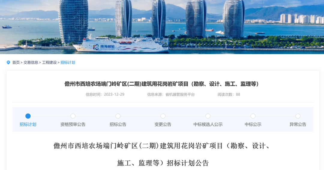 儋州市西培農(nóng)場端門嶺礦區(qū)(二期)建筑用花崗巖礦項目(勘察、設(shè)計、施工、監(jiān)理等)招標計劃公告