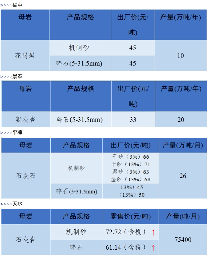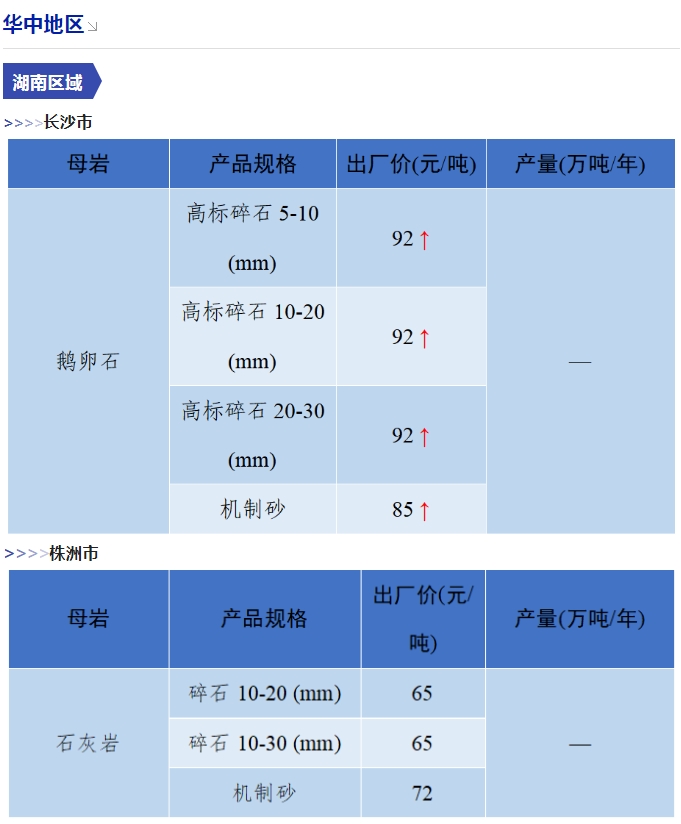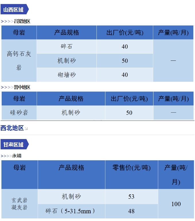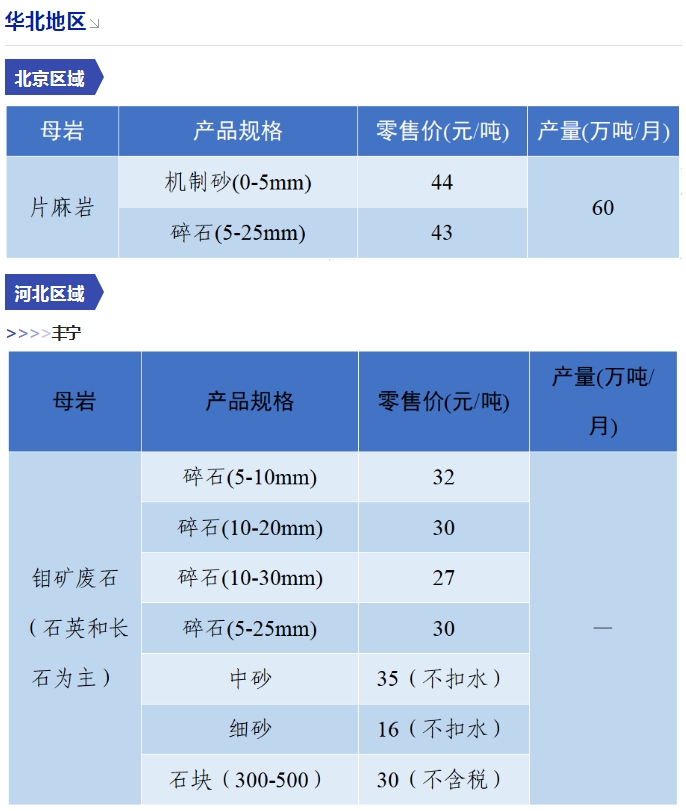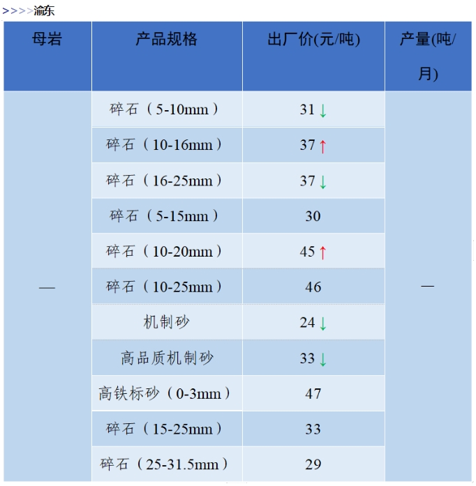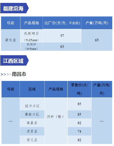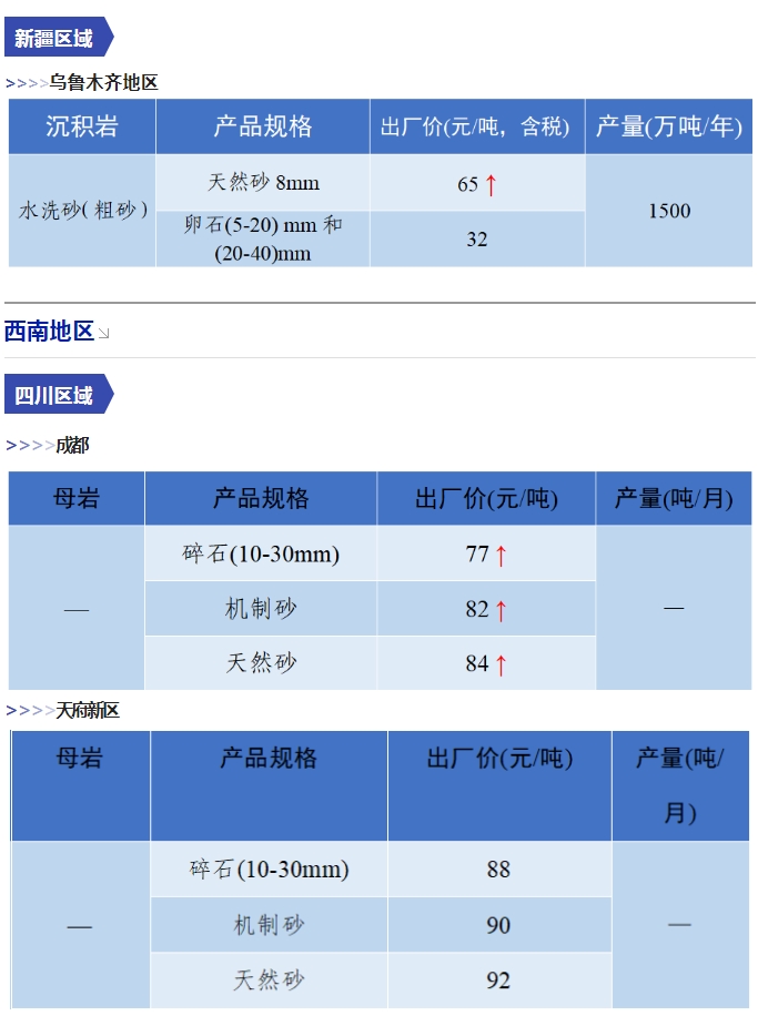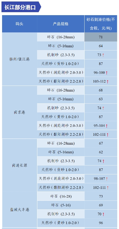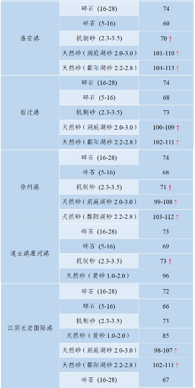 上漲 成都碎石77元/噸,上漲2元/噸,機(jī)制砂82元/噸,上漲2元/噸,天然砂82元/噸,上漲2元/噸。 甘肅天水市機(jī)制砂72.12(含稅),上漲11元/噸,碎石61.14元/噸,上漲6元/噸。 湖南長沙高標(biāo)碎石92元/噸,上漲3元/噸;機(jī)制砂85元/噸,上漲7元/噸。 長江沿線港口機(jī)制砂石、洞庭湖、鄱陽湖砂全線上漲,普遍漲幅在2-4元/噸左右。南京港天然砂(洞庭湖砂2.0-3.0)95-104元/噸,上漲5-8元/噸;南通長源(洞庭湖砂2.0-3.0)98-107/噸,上漲5-12元/噸。 下降 重慶渝東碎石(5-10mm)31元/噸,下降2元/噸;碎石(16-25mm)37元/噸,下降3元/噸;機(jī)制砂24元/噸,下降3元/噸,高品質(zhì)機(jī)制砂33元/噸,下降8元/噸。 重慶渝北機(jī)制砂48元/噸,下降6元/噸,高品質(zhì)機(jī)制砂54元/噸,下降6元/噸,碎石(5-10mm)45元/噸,下降6元/噸。 溫馨提示:部分價格為相關(guān)企業(yè)代表性價格,不代表當(dāng)?shù)仄骄鶅r格,價格僅供參考。 臨近年關(guān),部分礦山開始停產(chǎn)停運(yùn),除大型基建項目趕工外,其他項目已經(jīng)進(jìn)入收尾階段,北方部分項目逐步進(jìn)入“停工”階段,請相關(guān)企業(yè)關(guān)注砂石價格和市場走向,根據(jù)自身實際情況合理安排生產(chǎn)和采購任務(wù)。