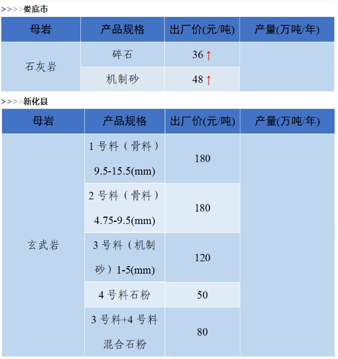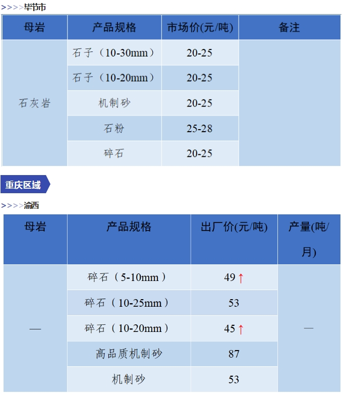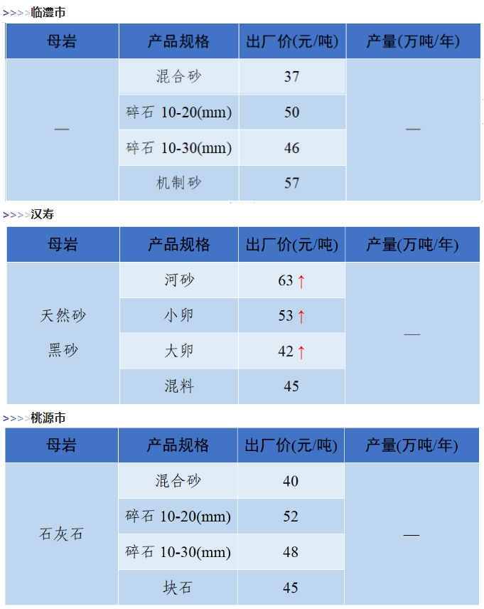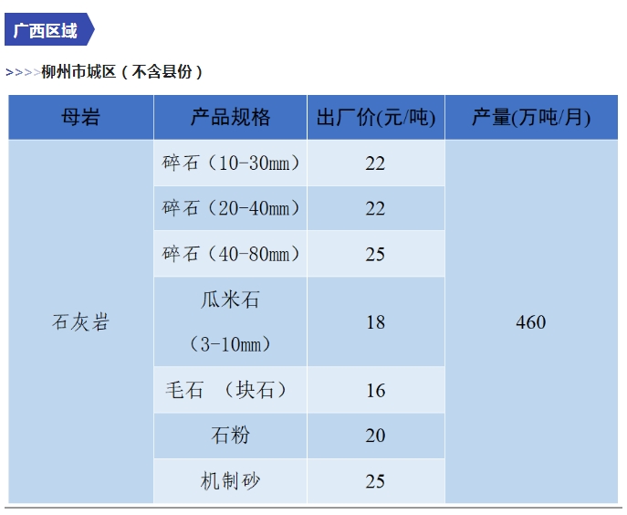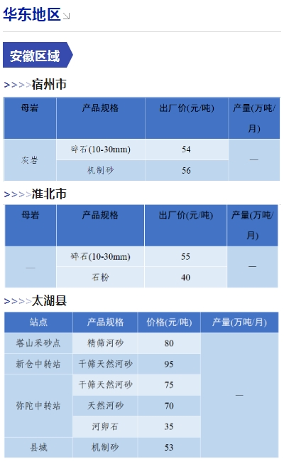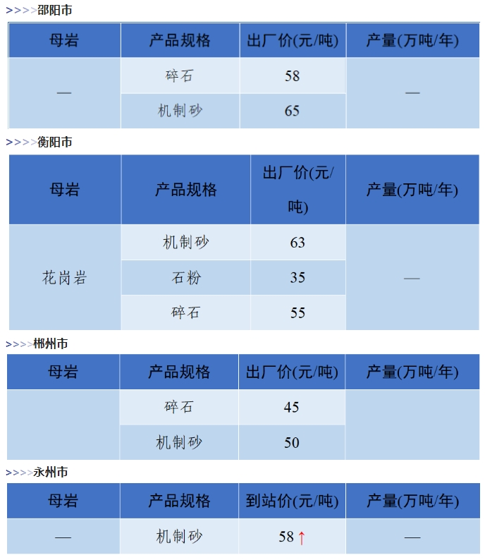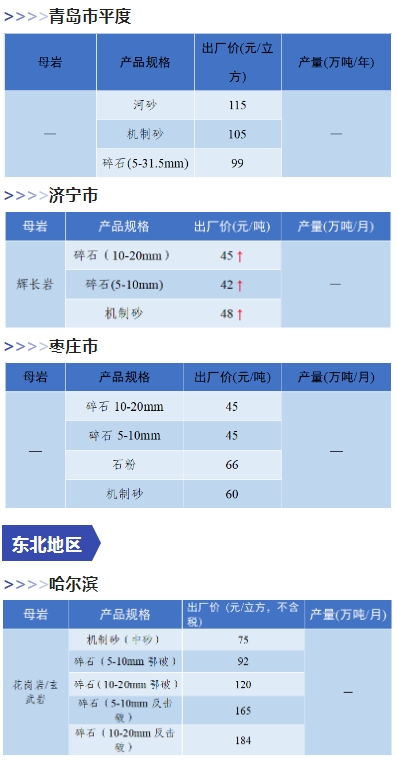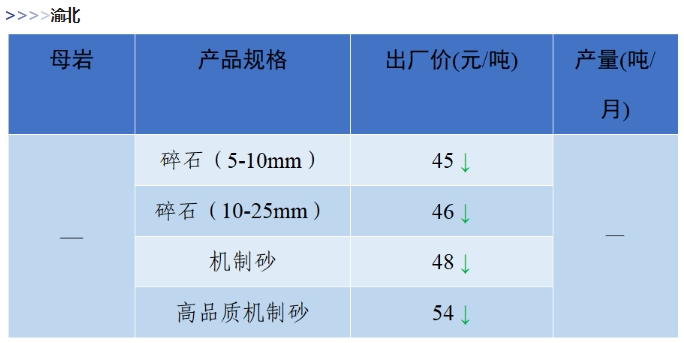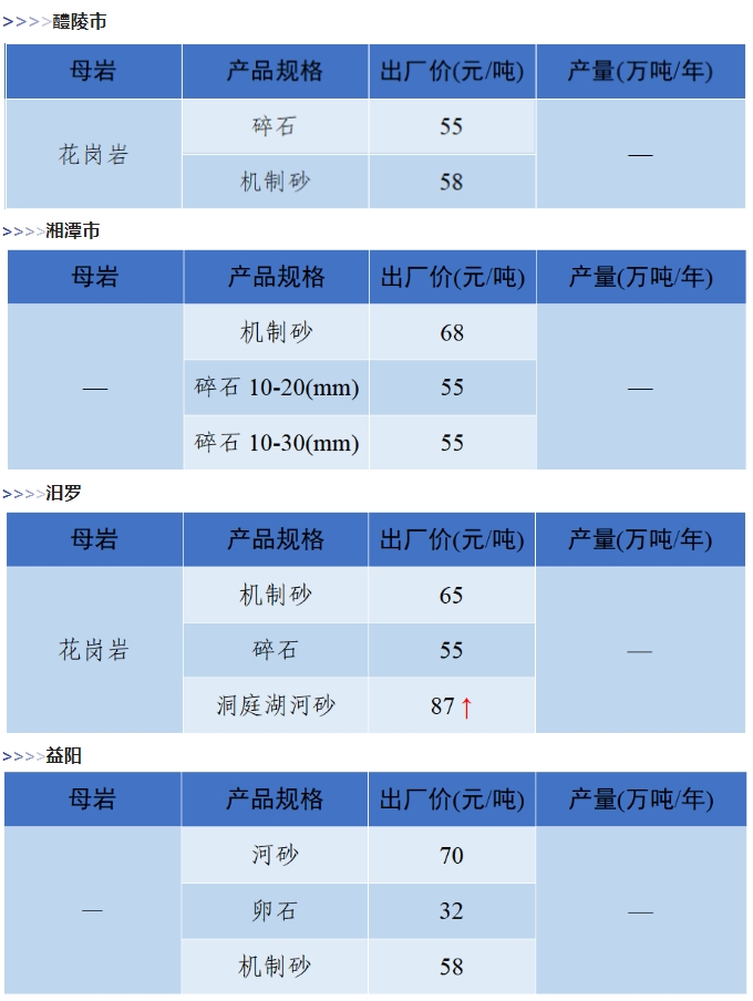 上漲 成都碎石77元/噸,上漲2元/噸,機(jī)制砂82元/噸,上漲2元/噸,天然砂82元/噸,上漲2元/噸。 甘肅天水市機(jī)制砂72.12(含稅),上漲11元/噸,碎石61.14元/噸,上漲6元/噸。 湖南長沙高標(biāo)碎石92元/噸,上漲3元/噸;機(jī)制砂85元/噸,上漲7元/噸。 長江沿線港口機(jī)制砂石、洞庭湖、鄱陽湖砂全線上漲,普遍漲幅在2-4元/噸左右。南京港天然砂(洞庭湖砂2.0-3.0)95-104元/噸,上漲5-8元/噸;南通長源(洞庭湖砂2.0-3.0)98-107/噸,上漲5-12元/噸。 下降 重慶渝東碎石(5-10mm)31元/噸,下降2元/噸;碎石(16-25mm)37元/噸,下降3元/噸;機(jī)制砂24元/噸,下降3元/噸,高品質(zhì)機(jī)制砂33元/噸,下降8元/噸。 重慶渝北機(jī)制砂48元/噸,下降6元/噸,高品質(zhì)機(jī)制砂54元/噸,下降6元/噸,碎石(5-10mm)45元/噸,下降6元/噸。 溫馨提示:部分價格為相關(guān)企業(yè)代表性價格,不代表當(dāng)?shù)仄骄鶅r格,價格僅供參考。 臨近年關(guān),部分礦山開始停產(chǎn)停運(yùn),除大型基建項目趕工外,其他項目已經(jīng)進(jìn)入收尾階段,北方部分項目逐步進(jìn)入“停工”階段,請相關(guān)企業(yè)關(guān)注砂石價格和市場走向,根據(jù)自身實際情況合理安排生產(chǎn)和采購任務(wù)。