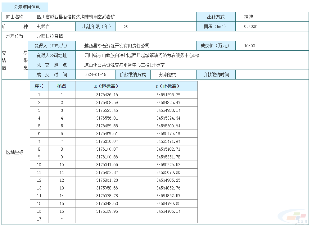 1月15日,越西縣砂石資源開(kāi)發(fā)有限責(zé)任公司拿下四川省越西縣吾洛拉達(dá)溝建筑用玄武巖礦采礦權(quán),擬出讓30年,年產(chǎn)200萬(wàn)噸,起始價(jià)1.04億元,成交價(jià)1.04億元。 該項(xiàng)目礦區(qū)面積0.4006平方千米,資源儲(chǔ)量2424.3萬(wàn)方。 越西縣砂石資源開(kāi)發(fā)有限責(zé)任公司成立于2017年11月,注冊(cè)資本4億元,由越西縣國(guó)有資產(chǎn)投資集團(tuán)有限公司100%控股,屬?lài)?guó)有企業(yè)。