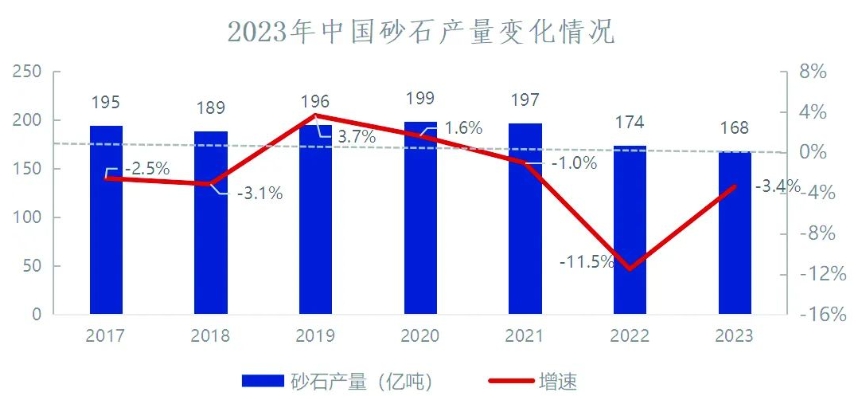 《報告》顯示,2023年,全國砂石產量168.35億噸,較去年下降3.35%。我國砂石行業之所以產量總體下降,關鍵在于需求端與供應端的嚴重失衡。在供給端方面,隨著國家多部門政策文件陸續發布,近年來國內投資