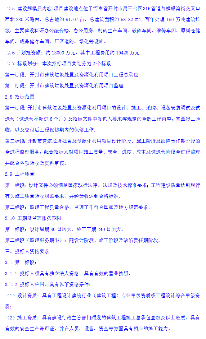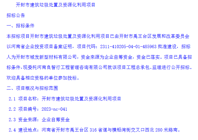 1.8億投資!開封市建筑垃圾處置及資源化利用項目總承包及監(jiān)理招標(biāo)公告