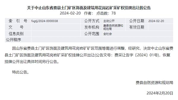 2024年1月19日,該礦被費縣自然資源和規劃局公開掛牌出讓;2024年2月20日,費縣自然資源和規劃局宣布中止該礦掛牌出讓。